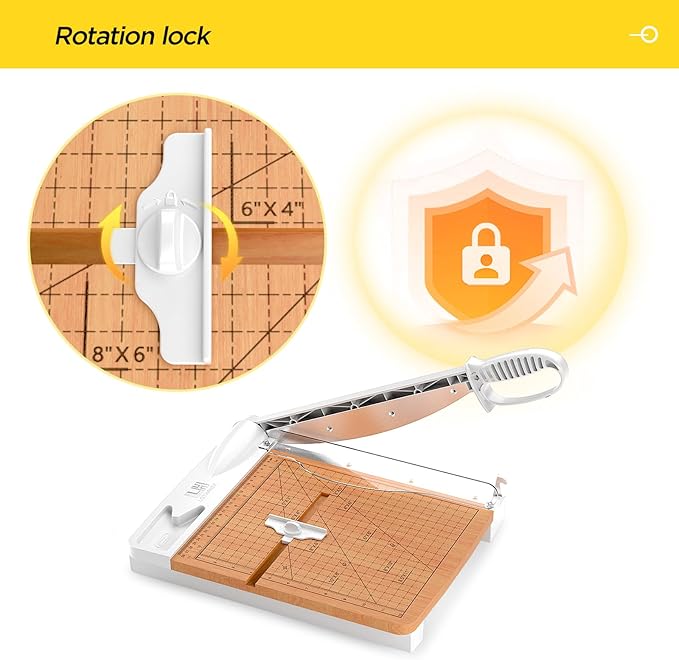 • Secure Clamping and Safety Features: Designed with a safety protect board,ergonomic handle, safety latch, and automatic lift, this guillotine prioritizes your safetyand comfort during use.