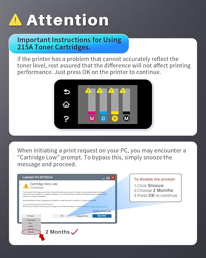 • 4. Cartridge Yield (approx.): Up to 1,050 pages per 215A Black, up to 850 pages per 215A Color (5% coverage of A4 paper)