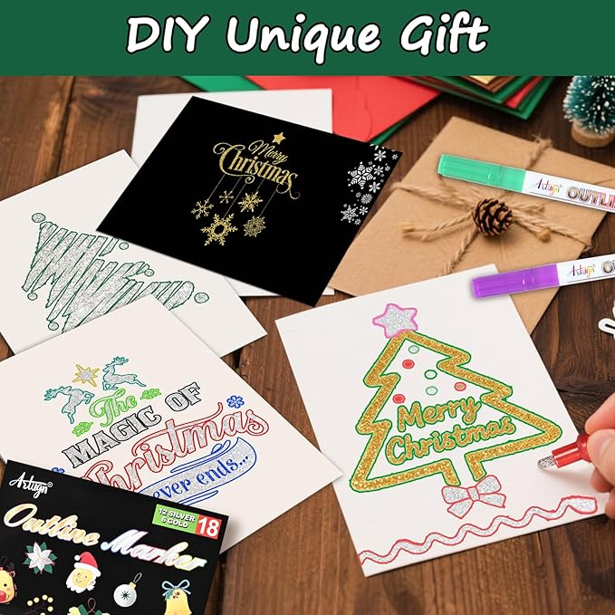- 【Widely Used】These sparkly outline pens set are suitable for DIY crafts such as Christmas gifts card, easter basket stuffers, wedding invitation cards, photo album, guest book, scrapbooking, envelopes, gift boxes,and creating birthday cards. Besides, they are suitable for various surfaces such as rock, stone, glass, wood, metallic, ceramic, etc. This 18 glitter outline markers add a sparkling embellishment to various crafts.