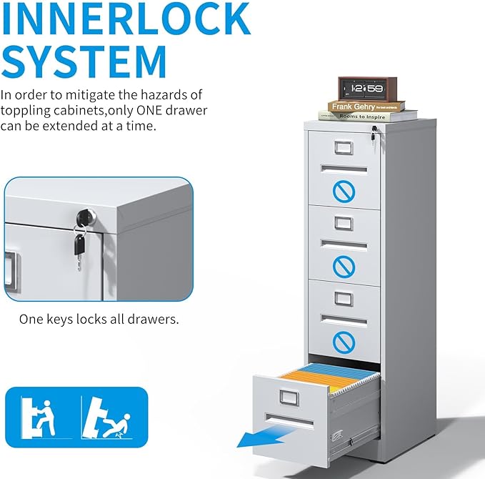 - 【Noiseless & Anti-Tipping Design】The smooth, quiet sliding rails make opening and closing drawers effortless and noise-free, allowing you to access your files without disturbing others in the workspace. The metal filing cabinet features a one-drawer-at-a-time mechanism, which prevents multiple drawers from being opened simultaneously. This design ensures the cabinet remains stable and reduces the risk of tipping, even when fully loaded. This thoughtful design ensures that your files are not only well-organized but also safely stored.