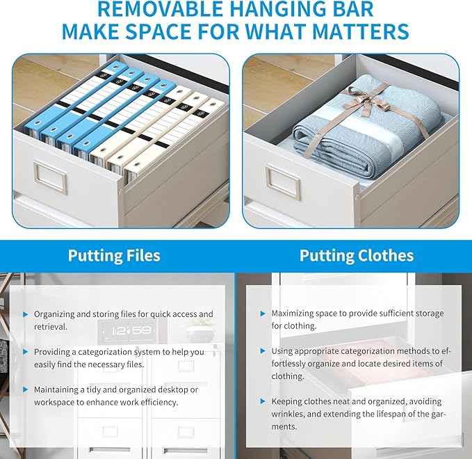 - 【Space-Saving & Versatile】This vertical file cabinet is designed to maximize storage capacity while minimizing the space it occupies, making it an ideal choice for small offices or home workspaces. Its compact design allows it to fit seamlessly into tight corners or narrow spaces, providing ample storage without cluttering the room.The adjustable hanging rods in each drawer allow you to customize the interior to suit your specific needs, whether you’re storing A4, letter, or legal-size documents.