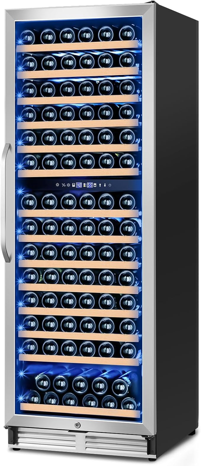 - DOUBLE-PANED THERMOPANE GLASS DOOR: Featuring a double-layer thermopane glass door with superior thermal insulation and frost-free properties, this wine refrigerator offers enhanced clarity to showcase your collection. The built-in blue LED lighting further highlights the beauty of your wines, combining aesthetics with functionality.