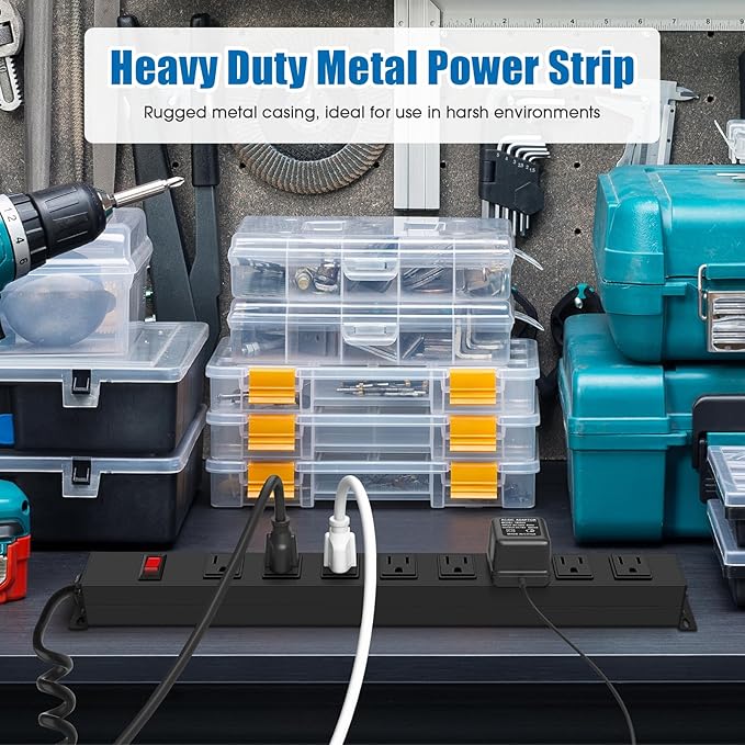 HHSOET 8 Outlet Metal Wall Mount Power Strip, Mountable Outlet with Switch, Heavy Duty Wide Spaced Surge Protector, 10 FT SJT 14AWG Black Spring Cord.
