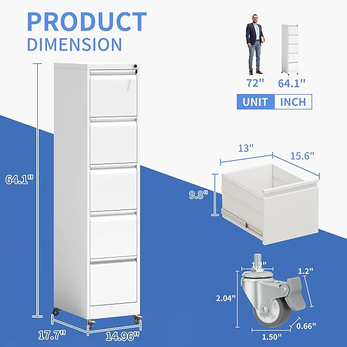 - 【Rolling Fill Cabinet】This 5 drawer under desk file cabinet equipped with 2 lockable casters, 2 x 360° swivel casters and1x anti-tilt wheel. The anti-tilt caster to prevent tipping over. You can easily move the cabinet with wheels, making it easy for you to move to another place.