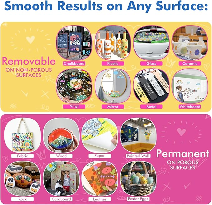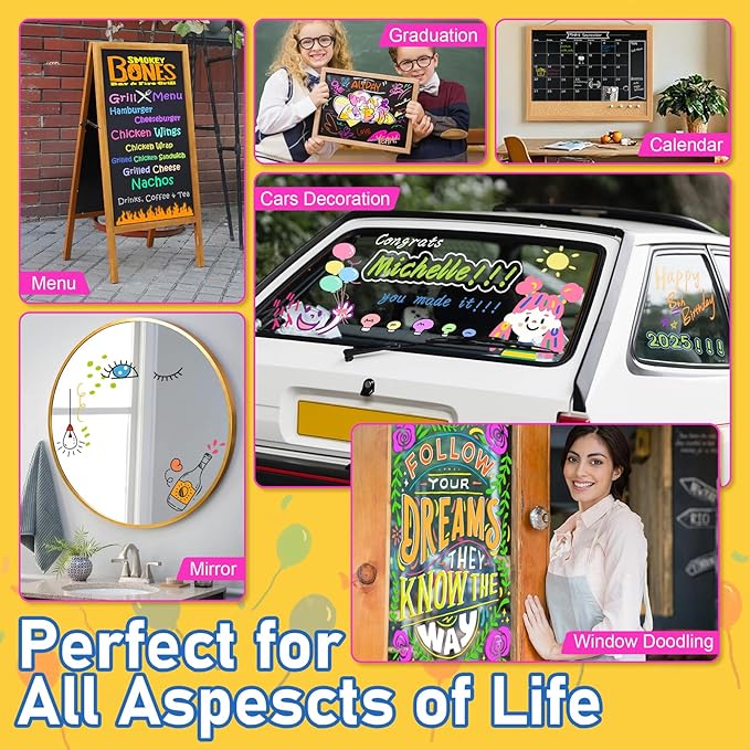 • 18 Vibrant Neon Colors:Car window markers use upgraded 3rd-gen ink for brighter,more vibrant fluorescent colors.Available in a variety of shades bright,metallic and vintage.All of them are rich in pigments,long-lasting and fade resistant.