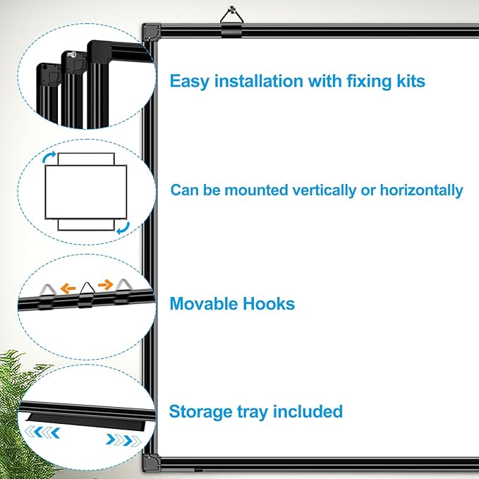 - ✔ Flexible installation – You can hang the magnetic whiteboard directly on the wall or install it hole-free with the complimentary removable hooks. There are two removable hooks on the long and short sides of the whiteboard, which can adjust the hanging distance according to your needs, allowing the white board to be hung vertically or horizontally.