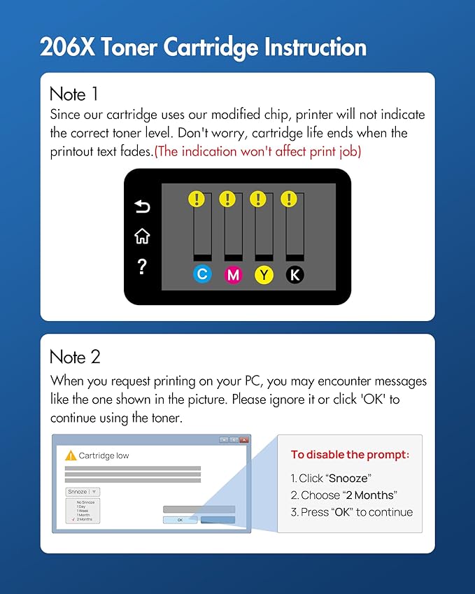 • Excellent Performance: 206X Toner cartridge 4 Pack High Yeild Replacement for hp 206a toner cartridges 4 pack count on high-quality, reliable printing and save time by avoiding common printing problems