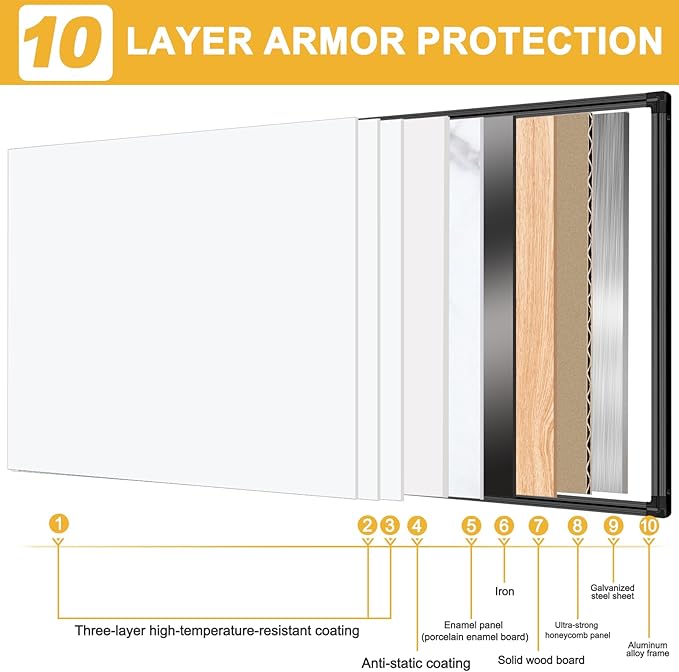- ✔️ Luxury Belgian Enamel Surface - The 8’x4’ magnetic dry erase board made of imported high-gloss porcelain steel delivers ultra-smooth writing, effortless wiping, and ZERO ghosting even after years of heavy use. Also, This whiteboard is both waterproof and fireproof, and it’s very eco-friendly.
