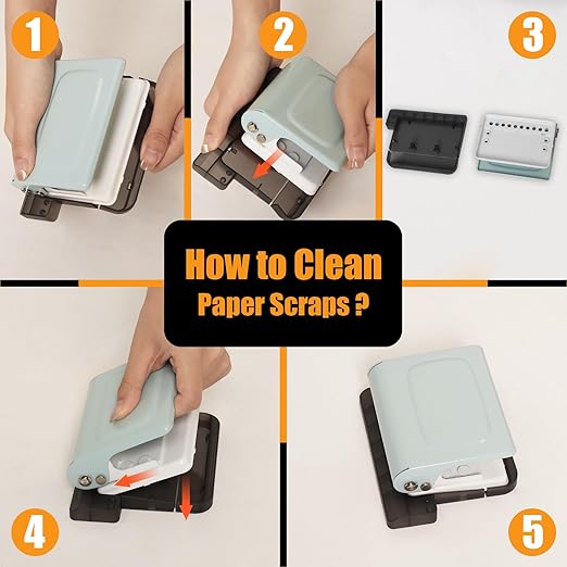 - Note: When punching holes, it's important to stand and apply force, as it's difficult to punch holes while sitting. If the hole punching fails, please check whether the paper chip collector is full. Emptying it will make punching easier. To clean the paper chips, you can open the entire bottom casing. When using the positioning pins, place the second-to-last hole from the previous punch onto the first positioning pin (counting from the inside out). Then, make sure the rear part of the paper is inserted inside. This ensures the holes are aligned straight and continuously