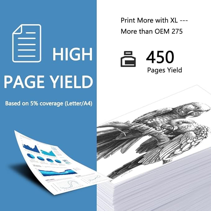 • Page Yield: Print More with XL --- Up to 450 pages per 275XL black ink(5% coverage)