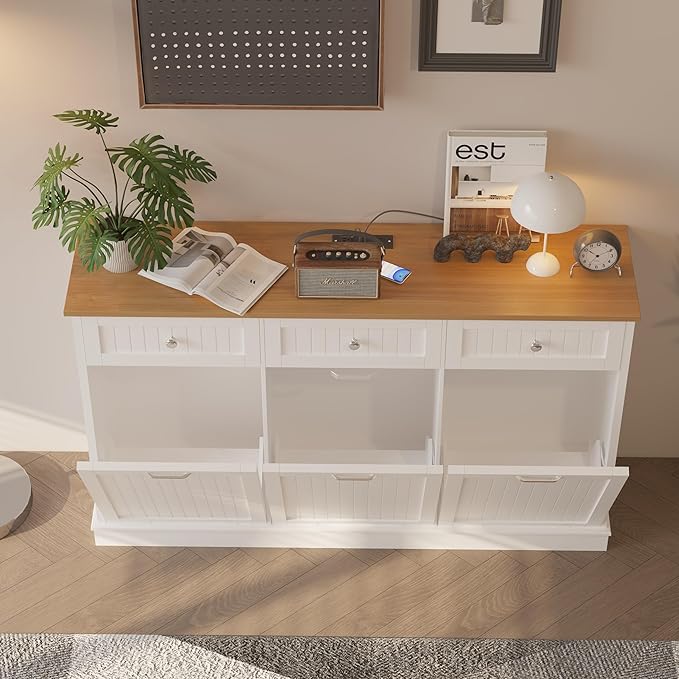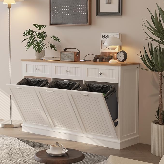 - Multifunctional Storage Hub: More than just a trash cabinet! Use it as a laundry hamper in the utility room, a dining room waste bin, or even a charging station—the built-in power outlet keeps devices powered up. The metal hinges holds the door tilt open for both hands to dispose of waste, while the drawer organizes trash bags and supplies